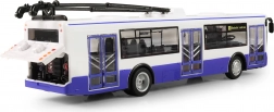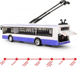 Rychle nastoupit, zavřít dveře a jedeme! Tento realistický trolejbus s délkou 28 cm v měřítku 1:43 oznamuje stanice v českém jazyce a jezdí na zpětný chod. Otevírací dveře lze ovládat manuálně, automatické zavírání tlačítkem na střeše doprovází blikající přední světla a české hlášení. Baterie jsou součástí balení – skvělý dárek pro malé řidiče i fanoušky ekologické dopravy.