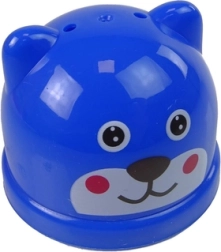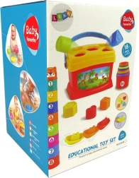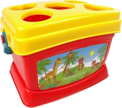 Kbelík s víkem slouží jako sortér tvarů se zvířecími motivy, což umožňuje interaktivní hru a rozpoznávání tvarů a barev.