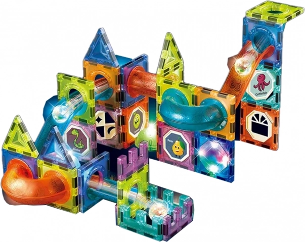 Transparentní barevné díly s dráhami a světlem promění každou konstrukci v zářivou podívanou. Děti si procvičí prostorové myšlení a fantazii.