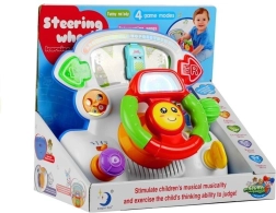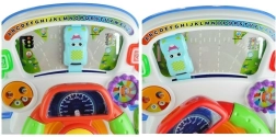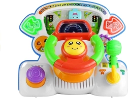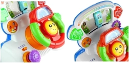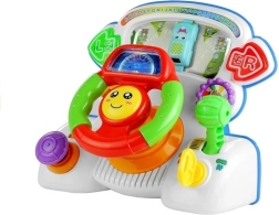 Interaktivní volant na palubní desce přináší dětem realistický zážitek z řízení v hravém a bezpečném provedení. Otočné prvky, páčka řazení, klíček ve spínací skříňce a směrovky doprovází blikající světla a různé zvukové efekty. Při otáčení volantem se pohybuje modré autíčko po „silnici“, posun rychlostního kotouče spouští veselé zvuky a další interaktivní překvapení.