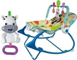 Odnímatelný oblouk s hračkami podněcuje smysly i motoriku – barevné závěsné hračky lákají k uchopení a zebra se zvukem po zatažení přehraje melodii. Když dítě povyroste, stačí sejmout bezpečnostní pásy a používat výrobek jako pohodlné křesílko. Snadná údržba potahu praním v pračce ocení každý rodič.