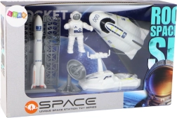 Raketa se startovací základnou, vesmírná loď, figurka astronauta, mini satelit, vesmírný skútr, originální balení