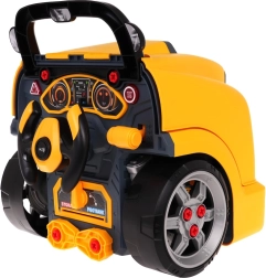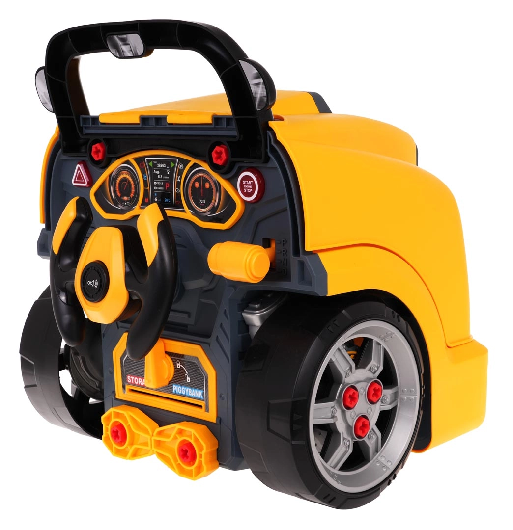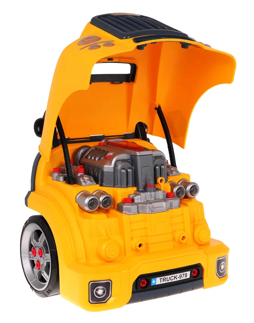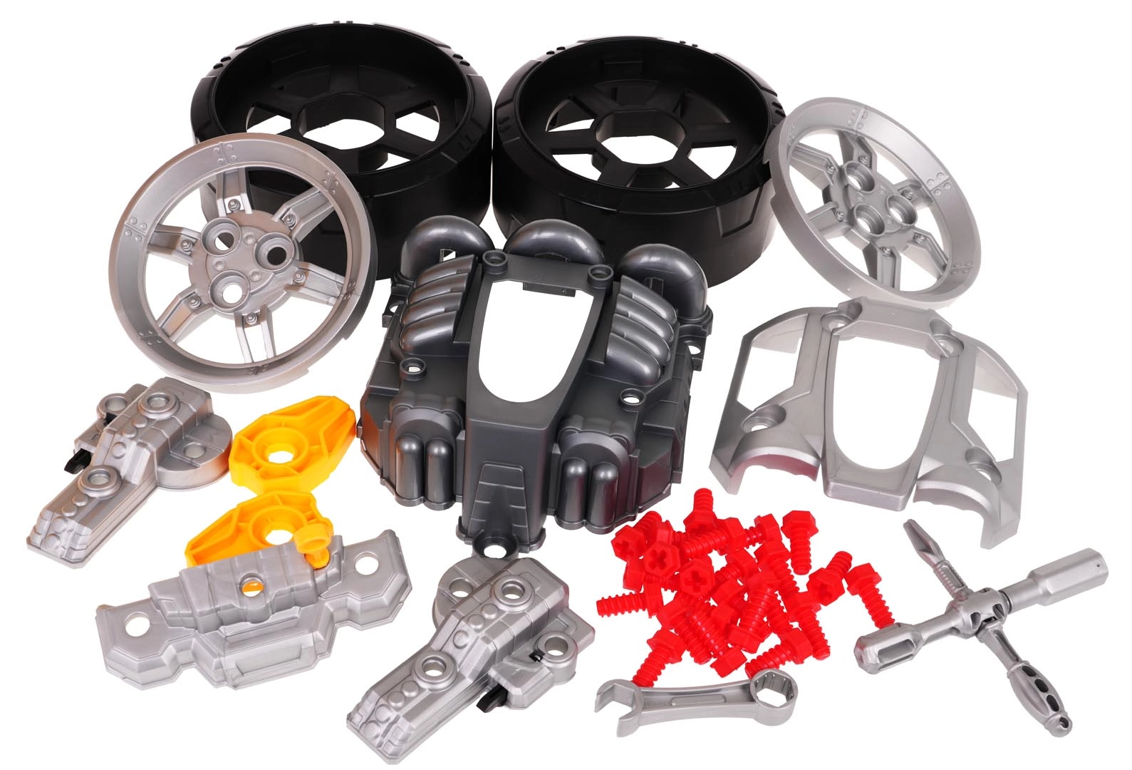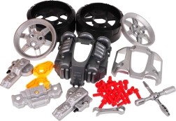 Součástí sady jsou šroubky, kola s poklicemi, šroubovák a klíče, dekorativní samolepky a návod. Hračka podporuje kreativní hru, učení se principům mechaniky a rozvoj motorických schopností díky šroubování, montáži a demontáži. Napájení: 3× AA 1,5 V (nejsou součástí).