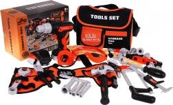 Tato bohatě vybavená sada nářadí nabídne dětem realistické pracovní zážitky. Plastová aku vrtačka v černo‑oranžové barvě má vyměnitelné bity, dva směry otáčení pro utahování i povolování a vyjímatelný „akumulátor“ pro ještě věrohodnější hru. Napájení: 2× AA 1,5 V (nejsou součástí balení).