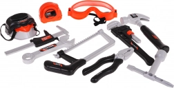 Kladivo, kleště, pilka, klíče, šroubovák s nástavci, úhelník, metr, šrouby, matice, hmoždinky, spojovací díly a ochranné brýle – vše pro kreativní stavění.