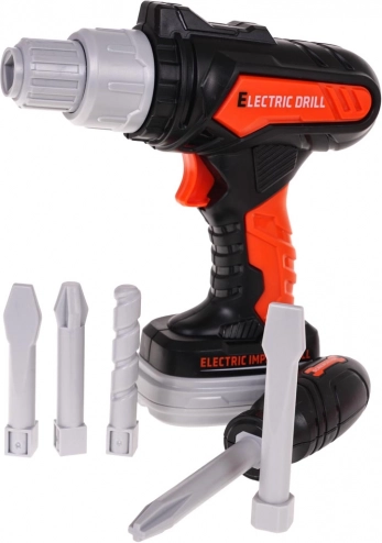 Plastová elektrická vrtačka s vyměnitelnými bity vypadá jako skutečná. Umí utahovat i povolovat, má ergonomický tvar a vyjímatelný „akumulátor“. Napájení 2× AA (nejsou součástí).
