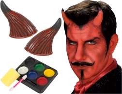 Sada je ideální pro Halloween, karnevaly nebo tematické večírky. Pomocí této sady můžete vytvořit strašidelný, ale i působivý vzhled, který upoutá pozornost. Kromě rohů a barev obsahuje také umělou krev pro dokončení ďábelské vizáže.