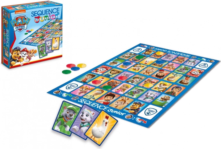 Sequence Junior Tlapková patrola je ideální rodinná hra, která kombinuje jednoduché principy s chytře navrženými prvky pro děti od 3 let. Hráči střídavě vykládají karty, umisťují žetony na odpovídající obrázky na desce a snaží se co nejrychleji sestavit řadu ze 4 žetonů. Speciální karty umožní překazit plány soupeřů a přináší do hry zvraty i radostné momenty.