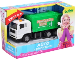 Připravte se na akci s popelářským autem velikým 17 cm, které je poháněno setrvačníkem. Díky světelným a zvukovým efektům přináší realistický zážitek. Tlačítka na kabině aktivují tři písničky od Míši Růžičkové: Popeláři, Policejní, a Sanitka.