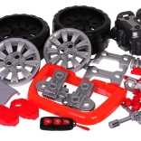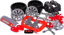 - přední část vozidla s rozebíratelným motorem, kola s poklicemi, skládací mini zvedák, šroubky, nářadí (např. šroubovák, klíče), dálková klíčenka, dekorativní samolepky, návod