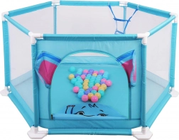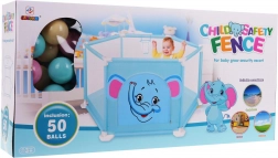 Součástí balení je 50 barevných míčků a uvnitř je také koš na házení, který podporuje motoriku i zábavnou aktivitu. Ohradník je lehce přenosný, vhodný do interiéru i exteriéru a jeho povrchy se snadno udržují.