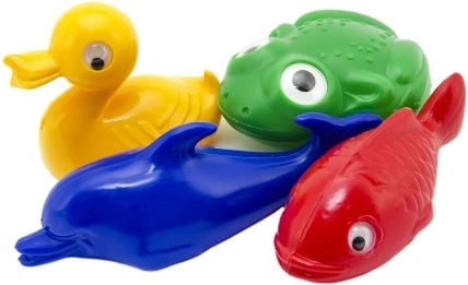 Roztomilá sada pro vodní hrátky obsahuje 4 plastová zvířátka – žlutou kačenku, modrého delfína, zelenou žabku a červenou rybku. Ideální do vany i bazénu a vhodná pro děti od 0+.