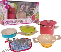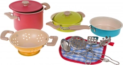 Tato barevná sada dětského nádobí přináší autentický zážitek z vaření do každé dětské kuchyňky. Dva hrnce s pokličkami, pánev, cedník a čtyři praktické kuchyňské nástroje poskytují vše, co děti potřebují k napodobování skutečného vaření. Díky kovovým materiálům je sada pevná, odolná a připravená na každodenní hraní.