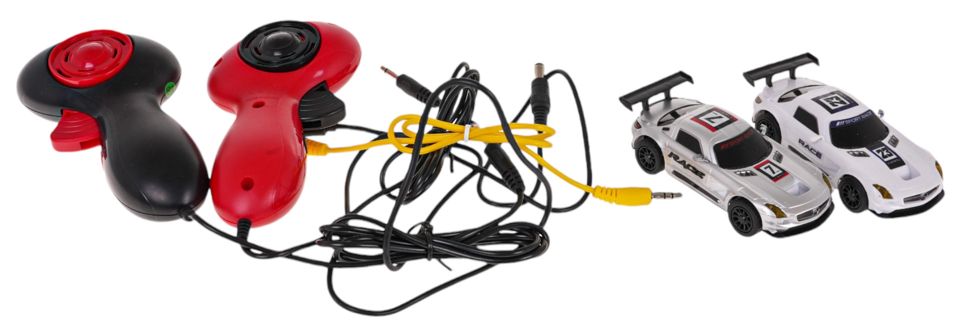 V balení jsou dvě autíčka a dva ruční ovladače s kabely – stačí sestavit trať a souboj může začít.