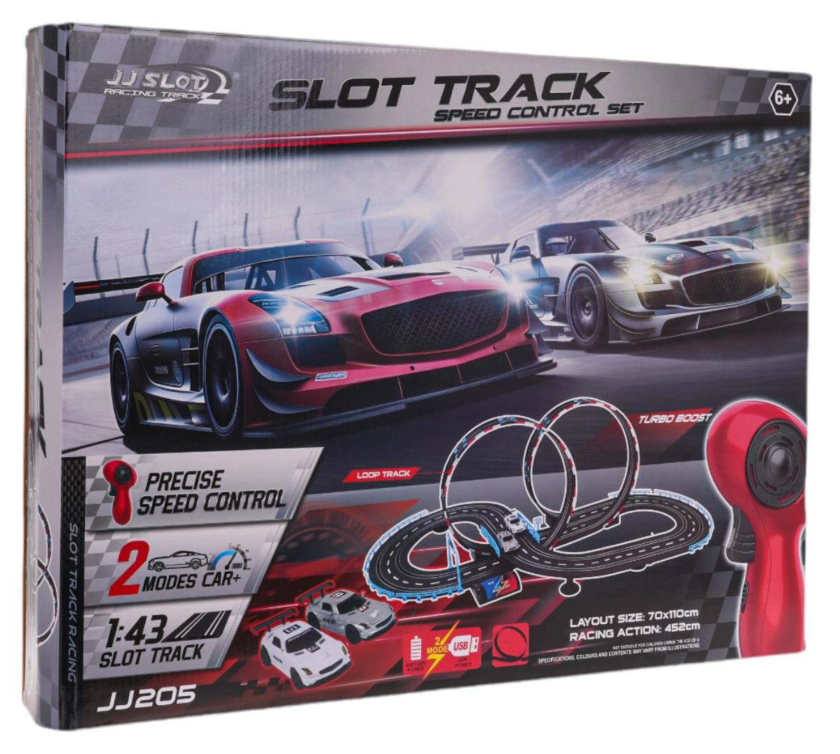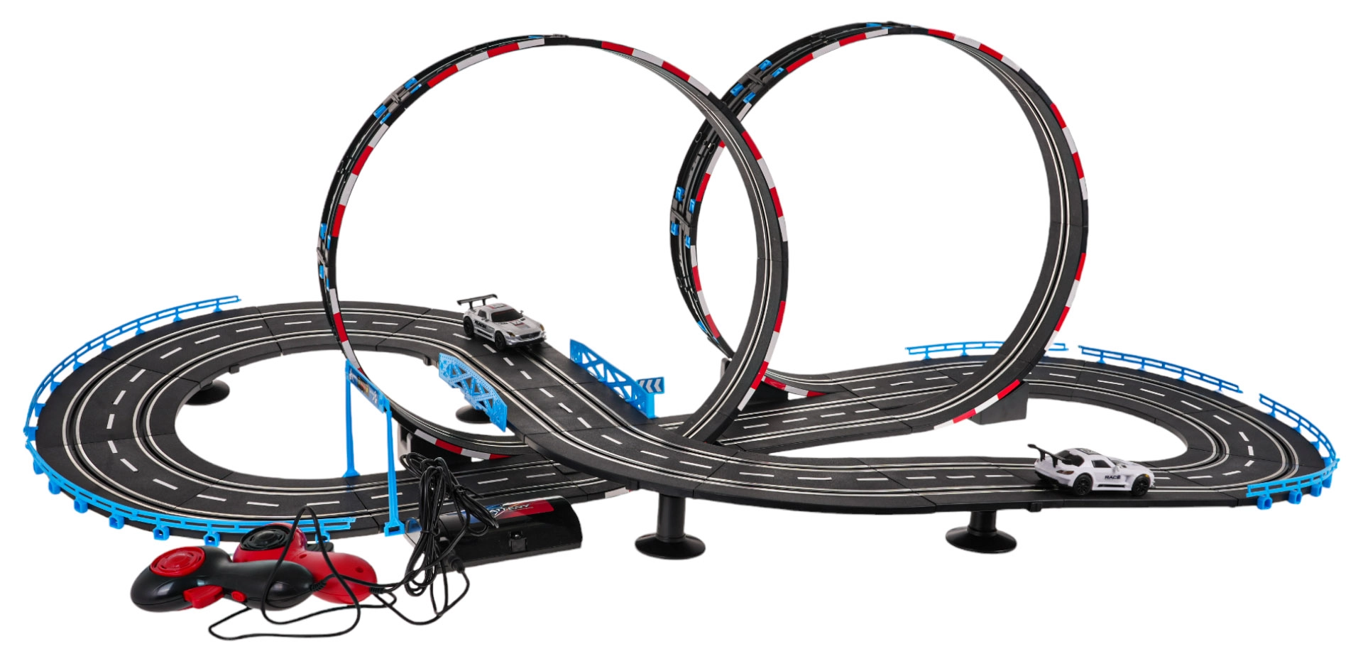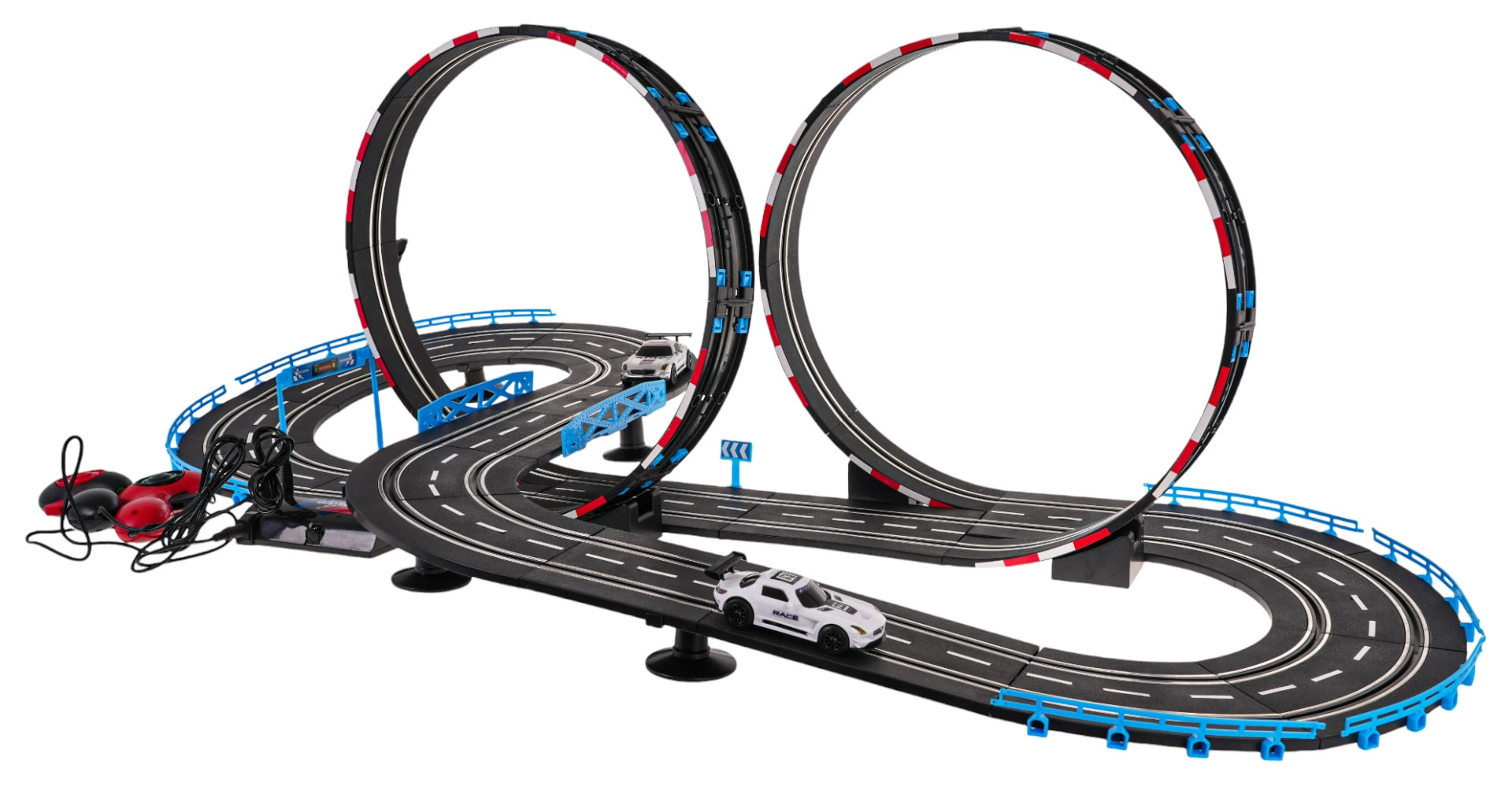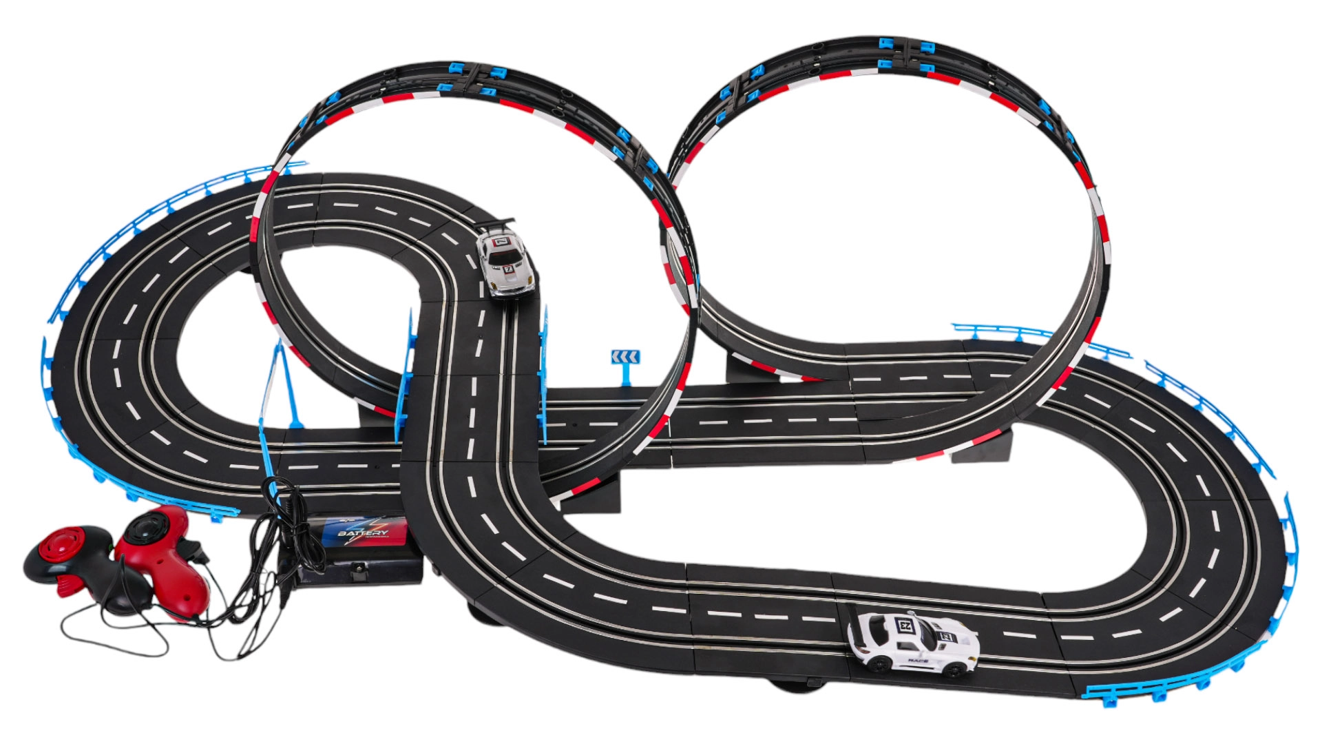 Postavte dynamickou trať s loopingy, spirálami a mostem a vyzvěte soupeře na souboj rychlosti. Dva ruční ovladače umožní citlivé řízení a plynulé zrychlení, takže si užijete napínavé předjíždění i sprint do cílové rovinky.