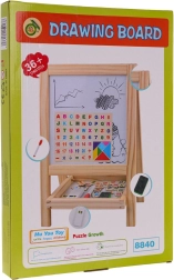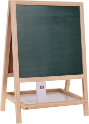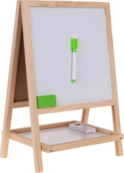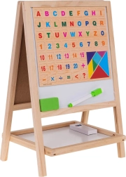 Oboustranná dřevěná tabule je ideální pro kreativní hru a učení dětí starších 3 let. Z jedné strany ji děti mohou používat s fixem, zatímco druhá strana je určena pro kreslení křídou. Tabule je na obou stranách magnetická, což umožňuje připevnění magnetických písmenek, číslic, matematických operací a prostorových tvarů. Praktická polička na spodní straně tabule usnadňuje ukládání všech přiložených pomůcek.