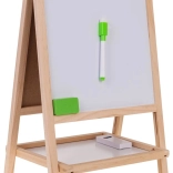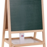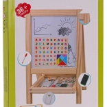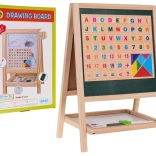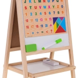 Dřevěná oboustranná tabule pro děti od 3 let. Jedna strana je bílá pro malování fixem, druhá černá pro malování křídou. Tabule je magnetická na obou stranách a zahrnuje písmena, číslice a geometrické tvary na magnetech.