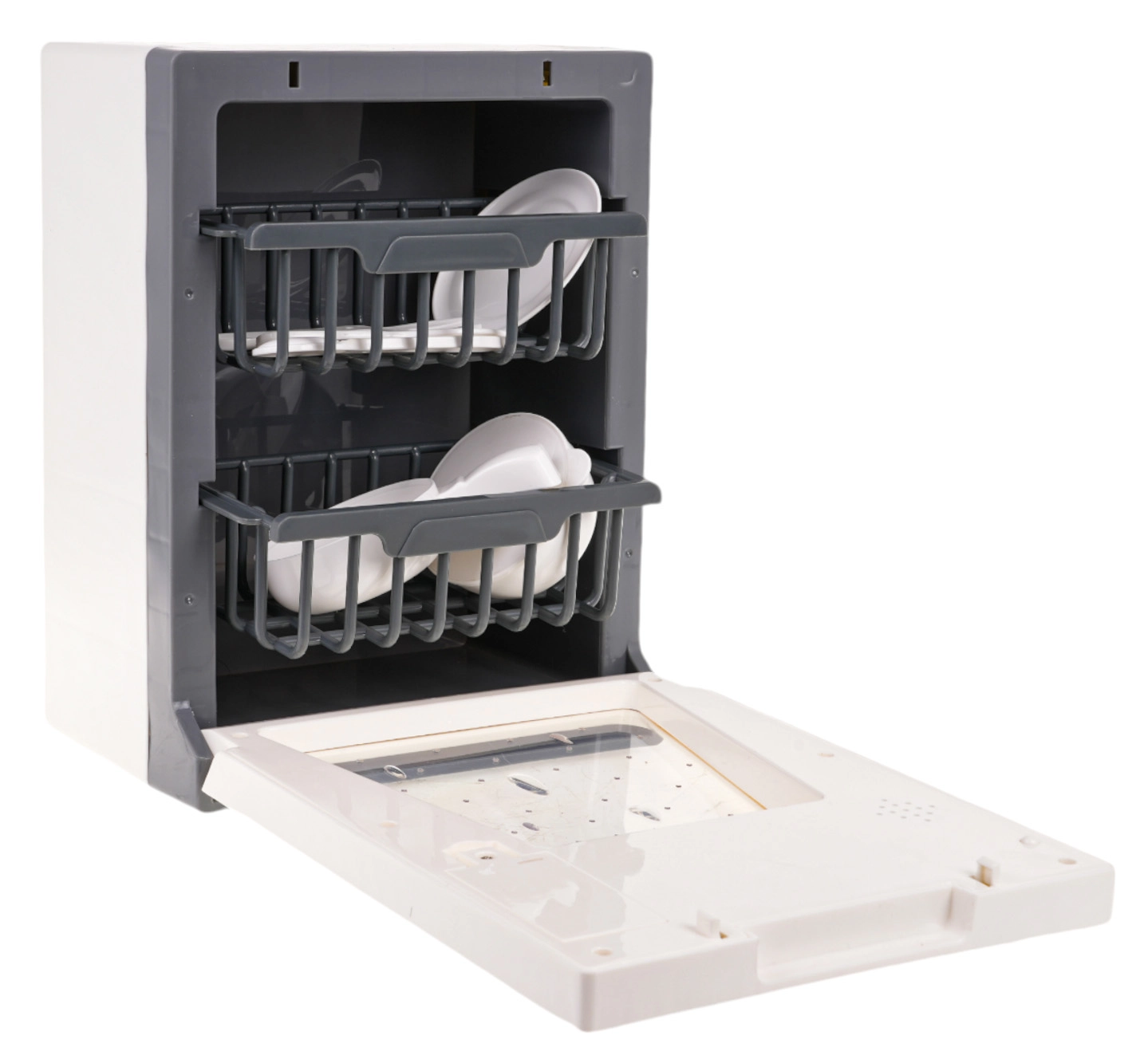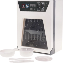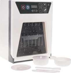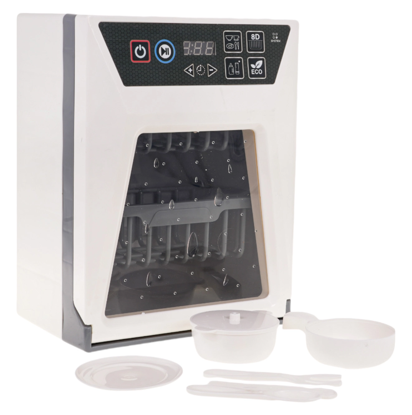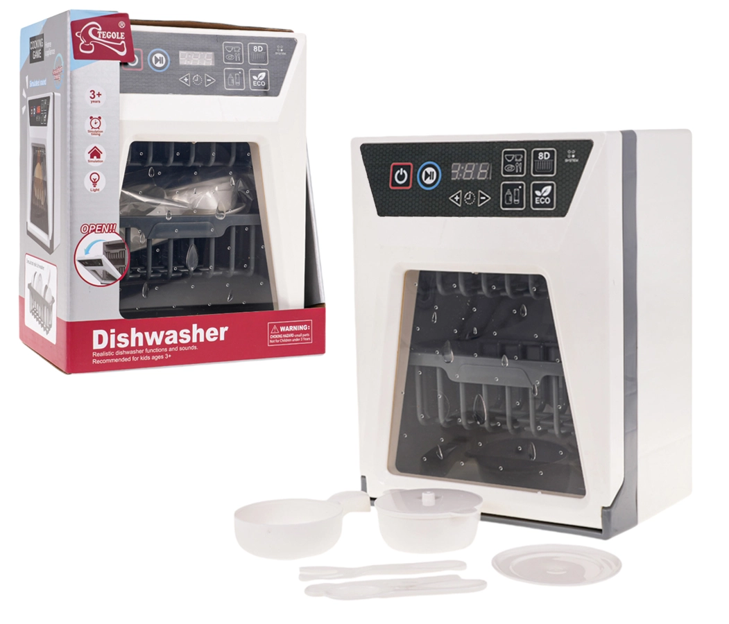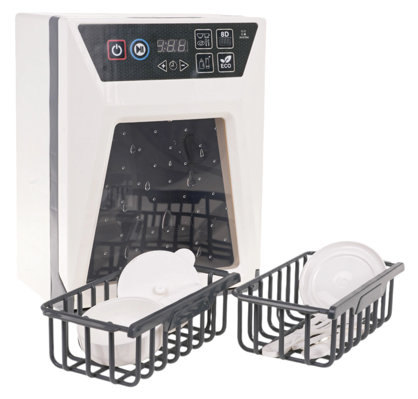 Tato interaktivní myčka vypadá jako opravdová – po stisku tlačítka na dotykovém panelu spustí zvolený program, rozsvítí se světla a ozvou se realistické zvuky. Dvířka se otevírají a dovnitř vložíte vyjímatelný koš na nádobí. Díky přehlednému displeji s odpočtem času děti snadno sledují průběh „mytí“.
