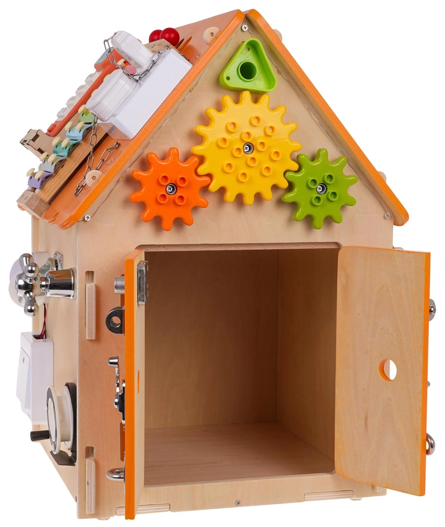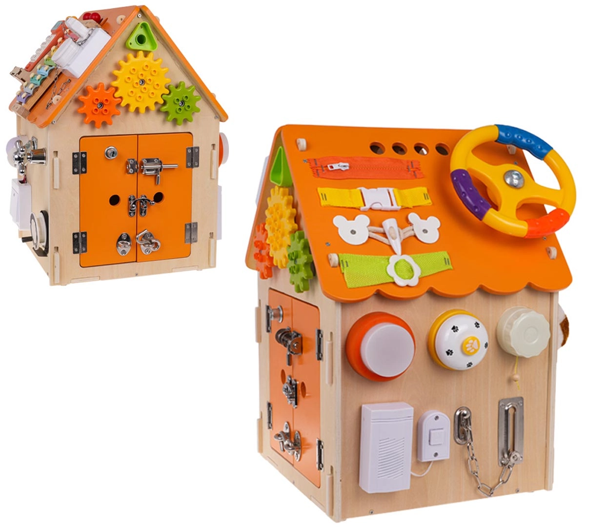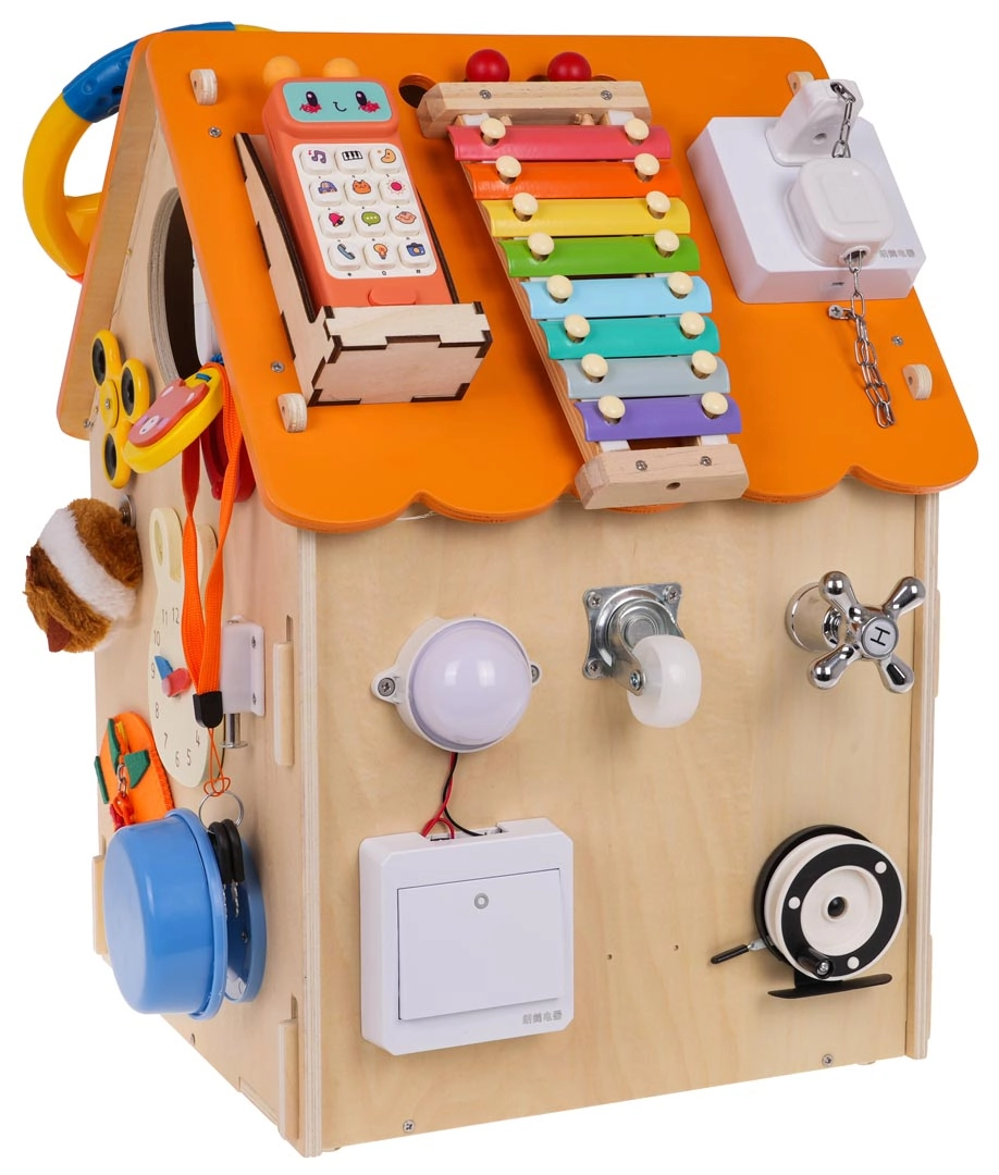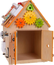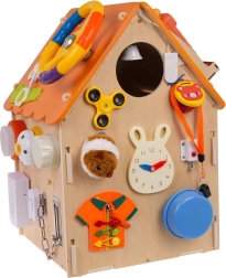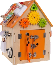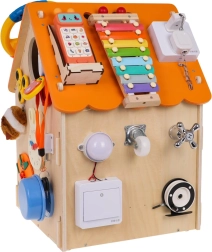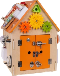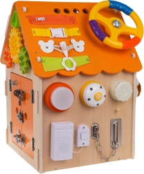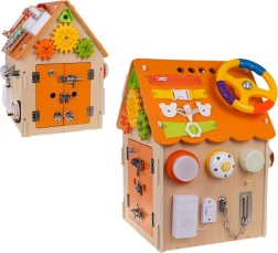 Objevte bohatě vybavený edukační domeček, který motivuje děti k objevování a samostatné hře. Každá stěna i střecha skrývá jiné úkoly: zipy, přezky, zámky, ozubená kola, vypínače, tlačítka, spinner či cimbálky s dřevěnými paličkami. Děti se přirozenou formou učí používat běžné prvky z každodenního života, rozvíjejí soustředění a trpělivost.