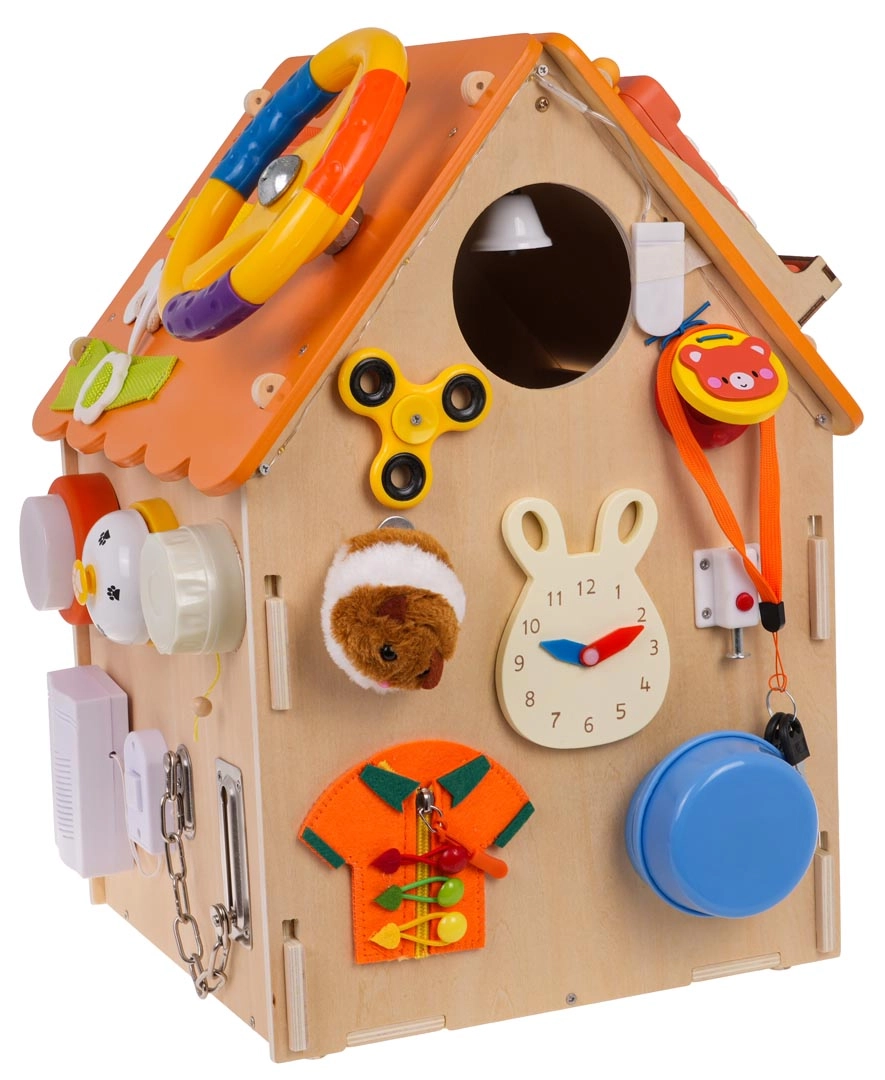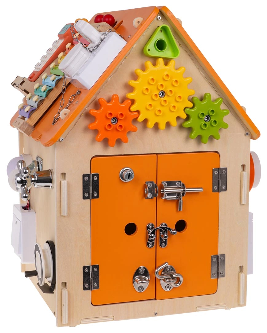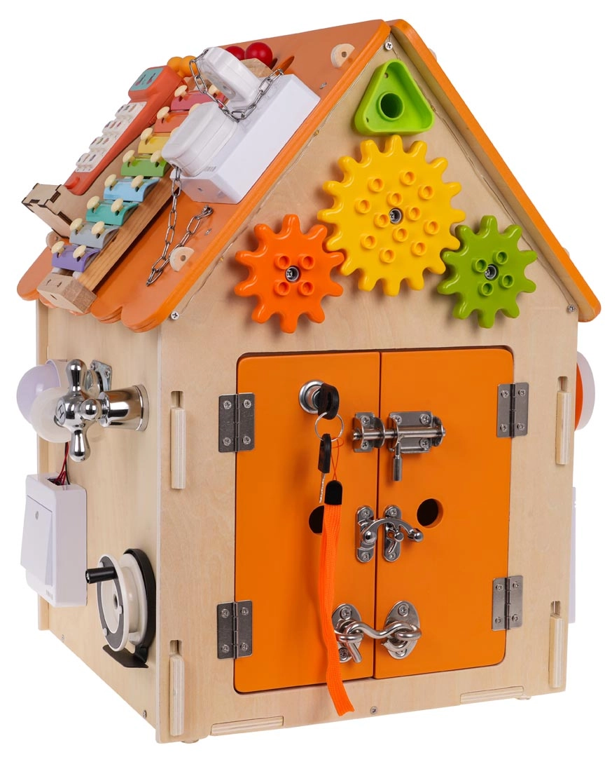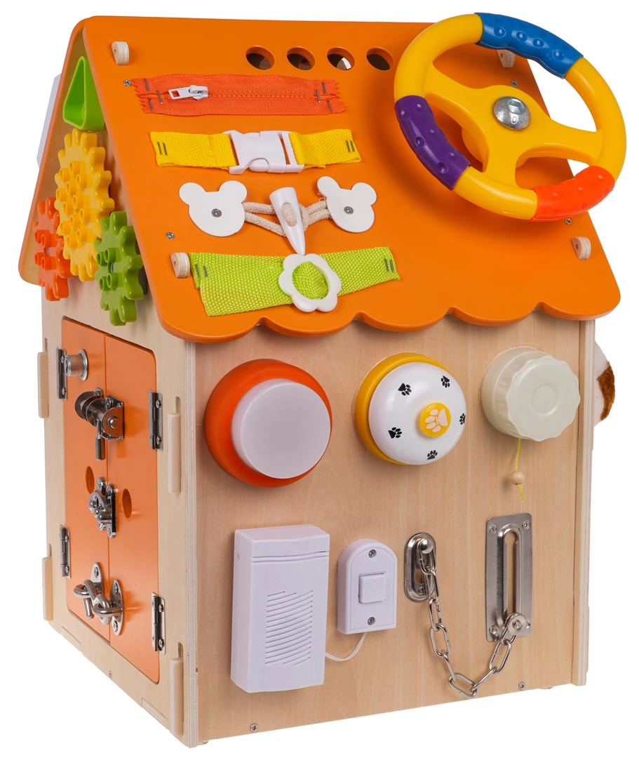 Objevte bohatě vybavený edukační domeček, který motivuje děti k objevování a samostatné hře. Každá stěna i střecha skrývá jiné úkoly: zipy, přezky, zámky, ozubená kola, vypínače, tlačítka, spinner či cimbálky s dřevěnými paličkami. Děti se přirozenou formou učí používat běžné prvky z každodenního života, rozvíjejí soustředění a trpělivost.