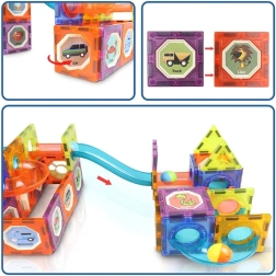 Magnetická stavebnice s 49 díly kombinuje tvoření, světelné efekty a dynamiku kuličkové dráhy. Průsvitné modré, oranžové a žluté prvky se snadno propojují a vytvářejí 3D konstrukce s tunely, mosty a zatáčkami. Svítící kuličky a podsvícené moduly přidávají hře efektní vzhled a podněcují zvídavost dětí.