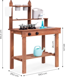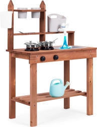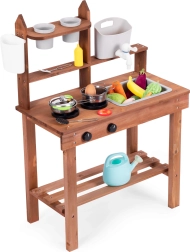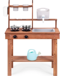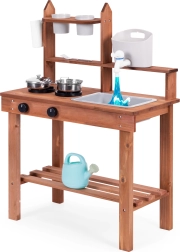 Podporuje rolové hry a umožňuje dětem „vařit“ z písku, hlíny či kamínků. Přehledné poličky a háčky udrží nádobí po ruce, zatímco kompaktní rozměry usnadňují umístění i v menších prostorech.