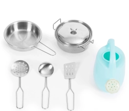 Součástí je hrnec s poklicí, pánev, dvě obracečky, naběračka a konvička – vše připravené na malé kulinářské experimenty.