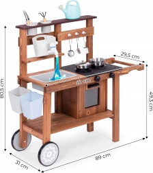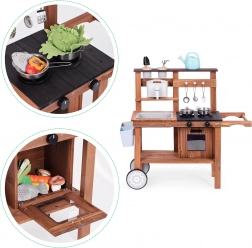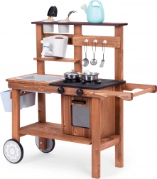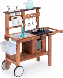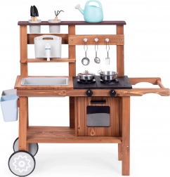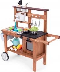 Dětská venkovní blátivá kuchyňka z jedlového dřeva od značky ECOTOYS přináší realistickou hru na vaření doma i na zahradě. Nabízí pracující kohoutek s nádržkou na vodu, otočné knoflíky hořáků s klikáním, dřez, skříňku/troubu a praktická kolečka pro snadné přesouvání. Součástí je sada kovových a zahradních doplňků, díky kterým děti rozvíjejí kreativitu a jemnou motoriku.