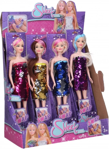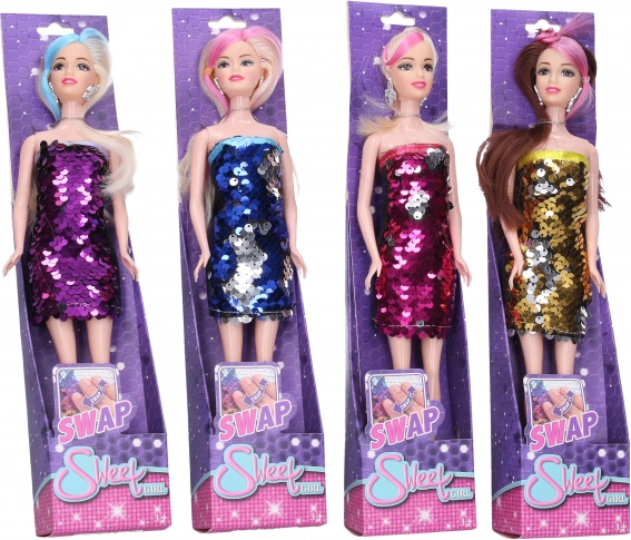 Obléct, učesat a hurá do města za zábavou! Tato stylová panenka s barevným pruhem ve vlasech a šaty s flitry, které mění barvy po přejetí rukou, je ideální pro každou malou slečnu.