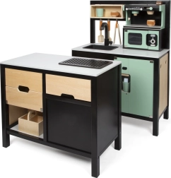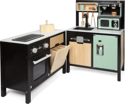 Stylová dřevěná dětská kuchyňka v industriálním vzhledu kombinuje černý rám a přírodní dřevo, nabízí praktický kuchyňský ostrůvek a spoustu realistických spotřebičů a příslušenství. Nechybí varná deska, trouba, mikrovlnná trouba, lednice s výrobníkem ledu, kávovar ani nádobí. Podporuje představivou hru, rozvoj role-play a sociálních dovedností.