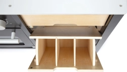 - Praktické úložné prostory: police, skříňky a ostrůvek pro přehledné uložení doplňků