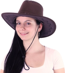 Stylový kovbojský klobouk pro dospělé v hnědé barvě s dekorativním prošíváním dodá vašemu outfitu autentický westernový vzhled. Poskytuje ochranu před sluncem, má větrací očká pro komfort a díky pevné konstrukci dobře drží tvar – ideální na karneval, festivaly i každodenní styl.