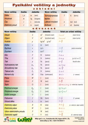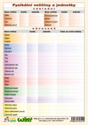 Praktická učební pomůcka ve formátu A5 nabízí přehlednou tabulku fyzikálních veličin a jednotek. Rozdělení na základní a odvozené veličiny, jejich značky, jednotky a vztahy pro určení usnadní rychlé opakování i přípravu do výuky. Zadní strana slouží k procvičování a přezkoušení učiva.