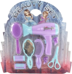 Zábavná kadeřnická sada pro malé stylisty od 3 let obsahuje bateriový fén o velikosti cca 16 × 15 cm, hřeben, kartáč, 2 natáčky, 2 sponky a nůžky. Vše je z odolného plastu a připravené pro bezpečné dětské hraní. Fén funguje na 2 baterie AA.