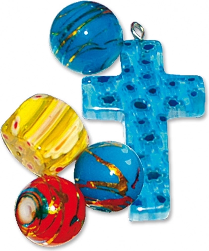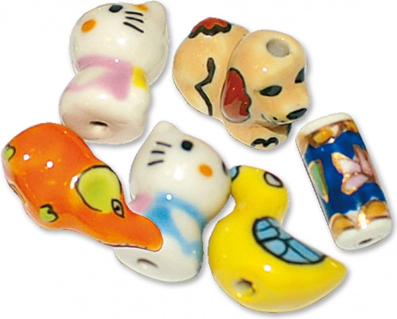 - Pestré korálky ze skla a keramiky v různých tvarech (srdce, kříže, zvířátka, válce)