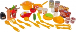 Pánvička, hrnec, talíře, příbory, koření i makety potravin – vše pečlivě sladěné pro dlouhé hodiny kreativní hry.