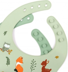 2× silikonový bryndák (1× s motivem lesních zvířat, 1× jednobarevný)