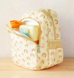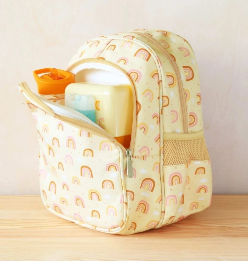 Roztomilý a praktický batůžek A Little Lovely Company s duhou si děti zamilují. Díky objemu 16 litrů snadno pojme svačinu, oblečení i oblíbenou hračku. Izolovaná přední kapsa udrží snack a nápoje déle čerstvé, boční kapsy jsou ideální na lahvičku.