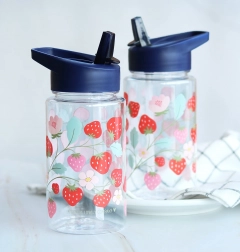 Průhledná dětská lahev na pití s potiskem jahod nabízí nepropustné zavírání, ideální velikost do školky i na výlety a bezpečný materiál Tritan / PP. Skvěle doplní sadu se stejným designem (batoh a krabička na svačinu).