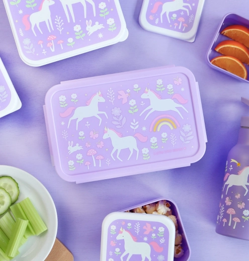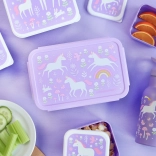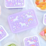 Rozkošný svačinový box od A Little Lovely Company potěší děti hravým designem s jednorožci a duhou a rodiče promyšleným zpracováním. Díky pevně těsnícímu víku zůstane obsah čerstvý a bezpečně uzavřený. Vyjímatelný tác se dvěma přihrádkami umožní přehledné rozdělení ovoce, zeleniny, pečiva či sladkostí.