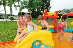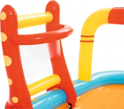 - Multifunkční zábava – skluzavka, kuželky, kroužky, koš, stříkající prvek.