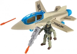 Souprava v krabici 27 × 18 × 12 cm obsahuje stíhačku, vojáka a doplňky – perfektní dárek pro malé milovníky armádních příběhů.