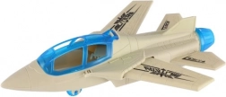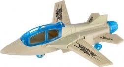 Stíhačka má modrý překryt kabiny, který lze otevřít, a viditelnou výzbroj s oranžovými koncovkami – ideální pro bezpečné a kreativní hraní.