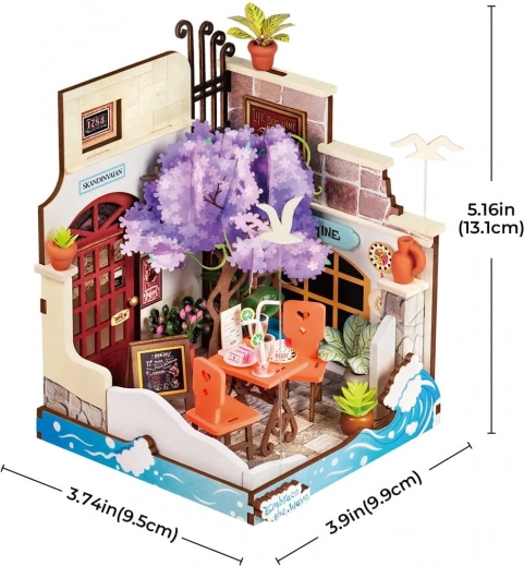 Miniatura domečku RoboTime Sea Holiday: 68 dílků, snadná obtížnost, sestavení za 1,5 h. Stylová přímořská restaurace jako kreativní DIY dekorace od 14 let.