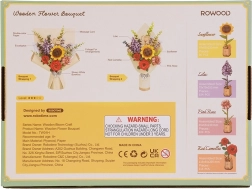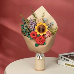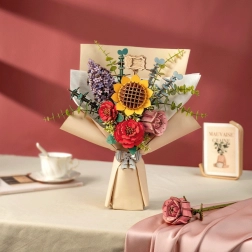 Objevte kouzlo květinové kytice, která se nikdy neztrácí na kráse. Dřevěná 3D skládačka obsahuje slunečnici, šeřík, červenou kamélii, růžovou růži a eukalyptus. Každá květina má nastavitelnou výšku stonku, což umožňuje různorodé aranžmá.