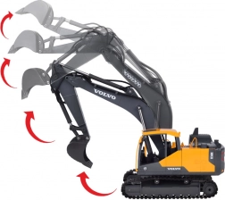 Stavební bagr Volvo je vybaven vyměnitelnými nádstavci - lžící, kladivem a úchopem, které umožňují simulovat různé stavební úkoly. Společně s rotacemi o 360° a intenzivním LED osvětlením nabízí neomezené možnosti zábavy a edukace.