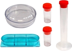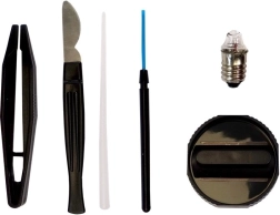 Součástí je bohaté příslušenství pro práci se vzorky: přípravná sklíčka, pinzeta, nástroje pro manipulaci, zkumavky, Petriho miska a zkušební materiály (např. mořská sůl). To vše dělá ze sady ideální start do světa biologie a mikroskopie.
