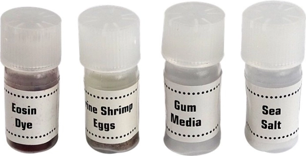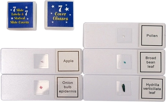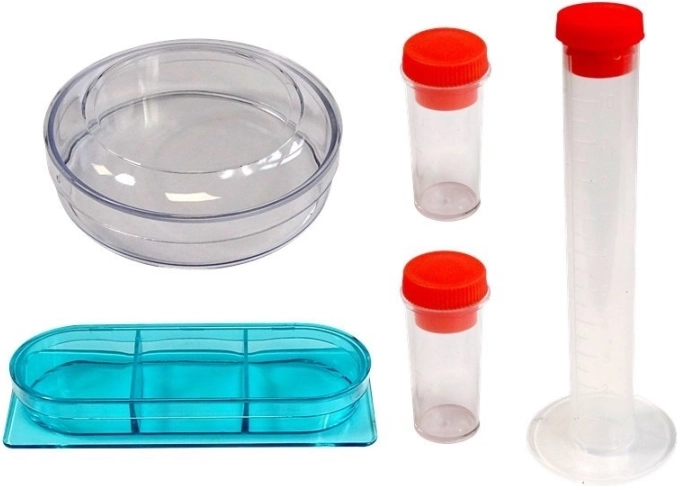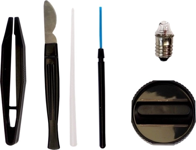 Mikroskop, pinzeta, nožík/špachtle, štěteček/palička, pipeta, 7× podložní sklíčko, 2× zkumavka, 1× velká zkumavka, Petriho miska, odměrné trubice, krabička, 4× vzorky (např. mořská sůl, eosin, vejce žábronožky, médium)