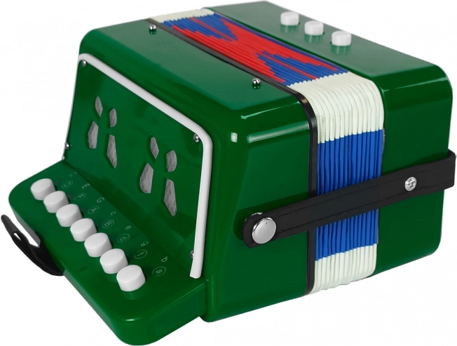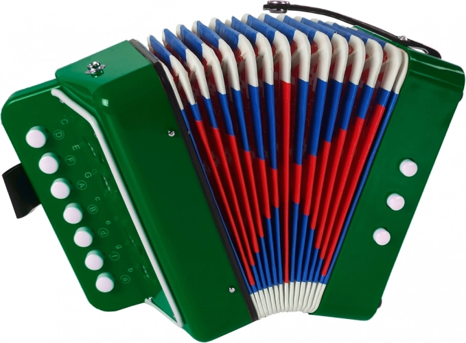 Tento zelený dětský akordeon věrně napodobuje skutečný nástroj – pro vytvoření tónu je potřeba roztahovat a stlačovat měch, díky čemuž se děti přirozeně učí práci s dechem, rytmem a koordinací. Odolné plastové provedení je lehké a pohodlné do dětských rukou.
