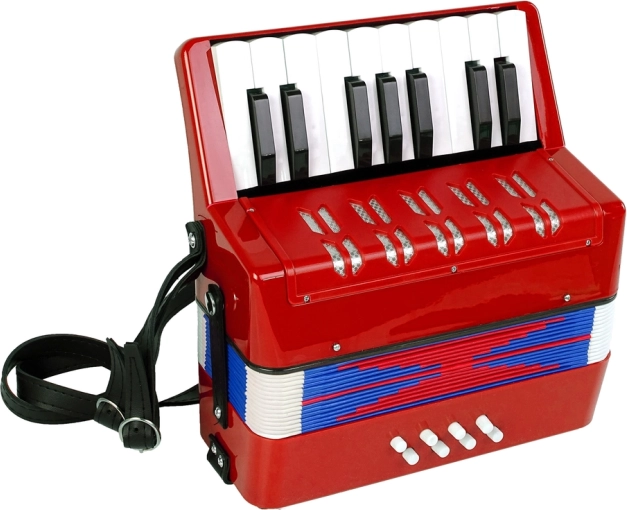 Dětský akordeon s 17 klávesami a 8 basy. Rozvíjí motoriku a hudební sluch, snadno se ovládá, ideální dárek od 3 let. Realistický vzhled a zvuk.
